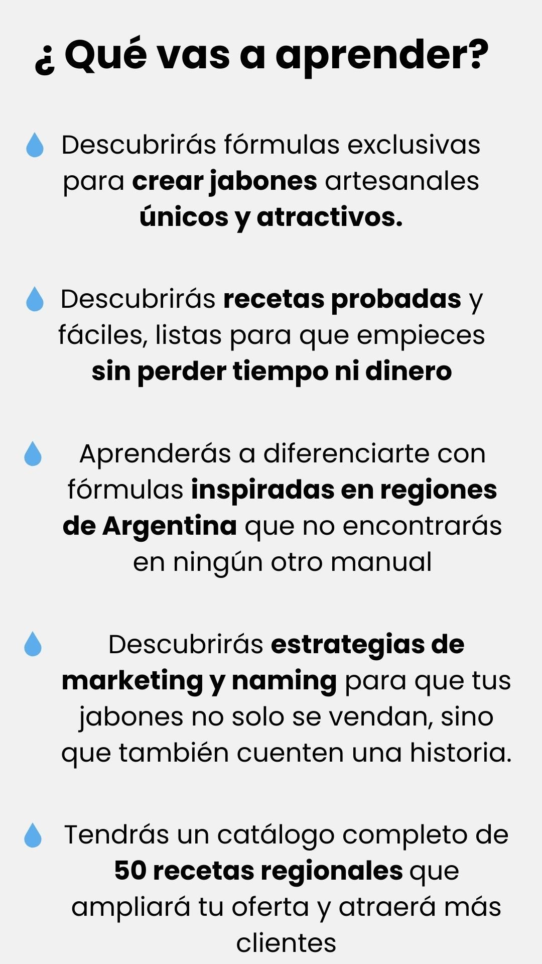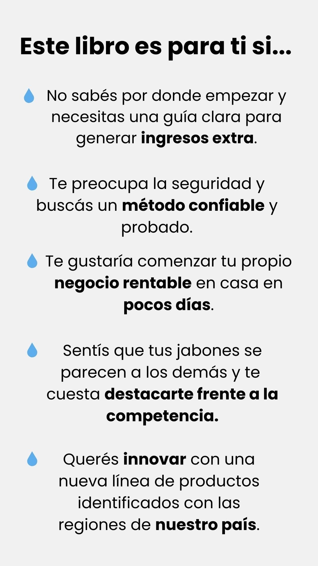 Es un libro digital que te enseña paso a paso a crear jabones artesanales, desde la selección de ingredientes hasta técnicas de venta, pensado para emprendedores que quieren iniciar su propio negocio.